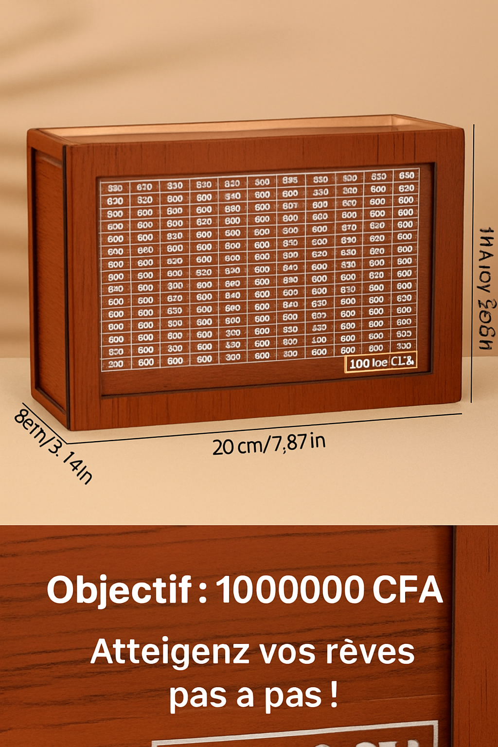 Cette boîte vous aide à économiser jusqu’à 1.000.000 FCFA de manière progressive et motivante. Chaque montant affiché sur la grille correspond à une somme à insérer. Vous rayez au fur et à mesure jusqu’à atteindre votre objectif.